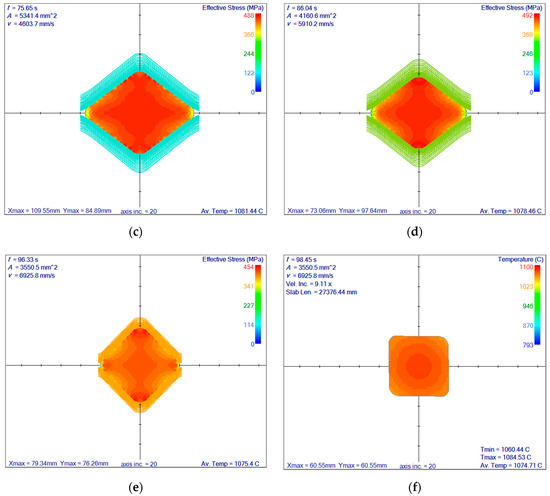 Second part of the reversing rolling mill simulation, where the roll diameter used is 650 mm before and after the billet is rotated 45 deg. In between the passes, it is rotated 90 deg. Results are shown in terms of effective stress filed. (a) After sixth pass, (b) after seventh pass, (c) after eighth pass, (d) after ninth pass, (e) after tenth pass, (f) final shape with temperature field.