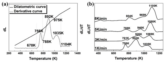 The dilatometric curve (solid curve) and its derivative (dotted curve) are shown in Figure 2a with a heating rate of 1 K/min as the representative. In the dilatometric curve, there are kinks that deviate from linearity, which are associated with the phase transformations. These dilatometric readings are more clearly shown on the derivative curves. The peak on the derivative curve is referred to as an ”expansion” response. Obviously, there were three expansions: