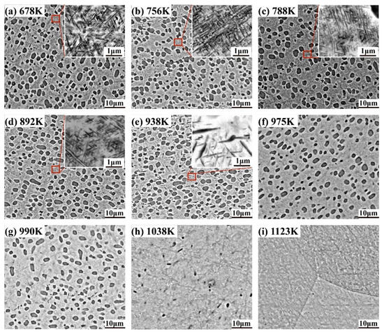 The microstructure of frozen bimodal Ti-55531 at (a) 678 K, (b) 756 K, (c) 788 K, (d) 892 K, (e) 938 K, (f) 975 K, (g) 990 K, (h) 1038 K, and (i) 1123 K during 1 K/min heating.