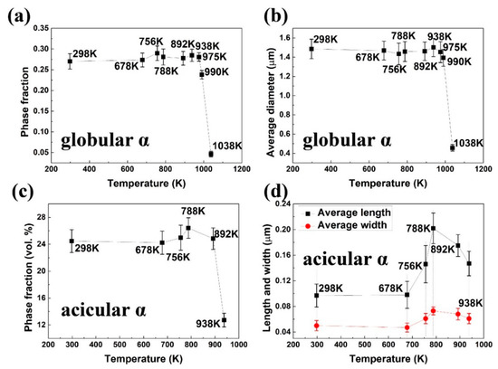 The variation of (a) volume fraction and (b) average diameter of globular α with changing temperature. Variation of (c) volume fraction and (d) average length and width of acicular α phase with changing temperature.