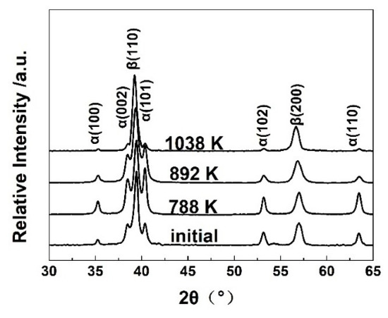 The shift of peak positions could be observed on XRD patterns for both α and β phases, indicating the expansion or contraction of the lattice. Based on the positions of XRD peaks, the average atomic volumes of α and β phase were calculated and then plotted in Figure 7. The figure shows that the average atomic volume of β phase was nearly unchanged below 788 K, followed by a monotonous increase. The average atomic volume of α was larger than that of β. It exhibited a slight decrease from 788 to 1038 K. The macro expansion in the temperature range of 678–788 K (Figure 2) was made from the formation of α phase with a larger average atomic volume than β phase. Above 788 K, the composition partitioning was more obvious than for lower temperatures. α → β transformation leads to Al atoms diffusing from α to β, while β-stabilizers diffuse in the opposite direction. The remarkable increase of average atomic volume in β phase not only offset the volume shrinkage due to the slight decrease of average atomic volume in α phase, but also gave rise to an overall expansion [6]. This is a synergistic effect of the thermodynamics and kinetics of the diffusional α → β transformation, leading to the macro expansion on the dilatometric curve above 788 K (Figure 2).