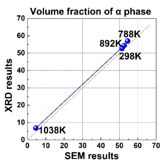 Figure 5 shows the XRD patterns of the bimodal Ti-55531 alloy quenched from 788, 892, and 1038 K. The intensity of α reflection increased from room temperature to 788 K, but gradually decreased from 788 to 1038 K. The XRD results suggest the α phase precipitated in the temperature range below 788 K, and underwent redissolution above 788 K. Moreover, the phase fractions of α and β phases could be calculated via the relative intensity of XRD peaks with the help of JADE software. The results are listed in Table 3. The calculated α phase fraction from XRD showed a good agreement with that obtained from SEM in Figure 6. The XRD results verify the determined phase transformation from SEM observation and dilatometer test. The consistency among the results derived from different characterizations indicates the reliability of our experimental data. The determined phase transformation reactions and temperatures are summarized in Table 3, alongside the dilatometric responses based on the above experiments and analyses.