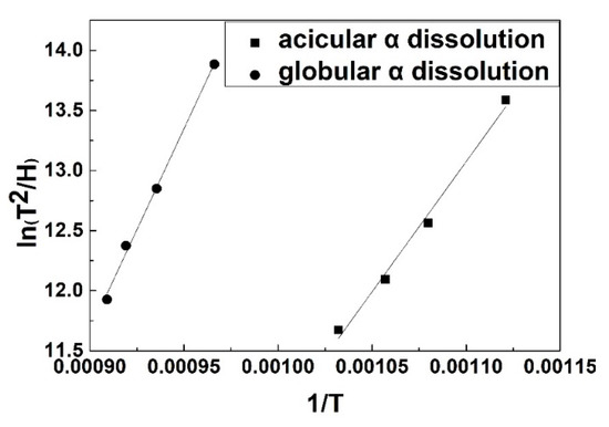 In Section 3, the dilatometric signals in continuous heating were successively correlated to the phase transformations β → αacicular, αacicular → β, and αglobular → β. The acicular α underwent dissolution prior to the globular α, indicating that morphology plays an important role in the thermodynamics and kinetics of dissolution. Here, the Kissinger method [18] was employed to analyze the activation energy of α redissolution: