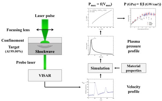 For pressure determination, the targets chosen were pure aluminum foils 99.00% from Goodfellows company (AL000645, Coraopolis, PA, USA) with a thickness of 1 mm. Aluminum is a material of choice for its well-defined properties. The thickness was chosen as a way to separate the first peak from the velocity profile from the second peak caused by the shock wave going back and forth inside the material. To ensure contact between the polymer and the aluminum target, every potential bubble was pushed away by applying low pressure on the adhesive. For the water-confined regime, a water droplet was apposed on the surface of the aluminum target. For each confinement and each laser intensity used, three samples were tested to minimize potential error and ensure reproducibility of the results.