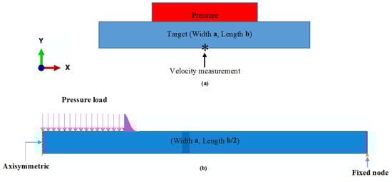 Target used for the laser shock peening (LSP) finite element (FE) modeling: (a) geometry and (b) 2D axisymmetric FE model.