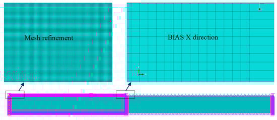 Figure 3 and Figure 4 respectively show the target configuration and the mesh used for simulation. The target was modeled as a planar shell with a 1 mm width and a 7.5 mm length. It was meshed by means of CAX4R elements (Continuum, 4-node bilinear axisymmetric, quadrilateral, reduced integration, hourglass control). To improve the accuracy of the FE solutions, a refinement mesh was used in the treated area with the use of a BIAS function in the X direction (Figure 4). As the element dimensions decreased, the obtained results became more stable. A decrease between experimental and numerical rear free-velocity profiles as observed. The treated region was refined with small elements of 1 m × 1 m dimensions. For the boundary condition, one node of the bottom surface was fixed (Figure 3).