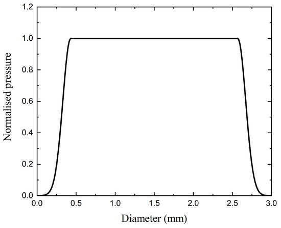 To generate spatial and temporal pressure profiles , a VDOLAD subroutine was used. The profiles given in Figure 5 [23] were adjusted to provide coherence between the experimental and the numerical results. The distribution was obtained (Figure 6) from beam analysis. The intensity profile from Figure 2b, obtained through a camera, was used to generate the distribution. Previous work on the subject showed the equivalence between maximum pressure and intensity [18,24]. Preliminary simulation showed that modulation had no effect on the rear free-velocity profile.