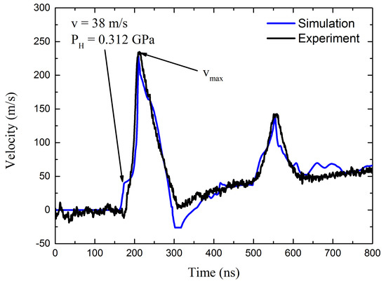 This calculation yields 0.179 GPa, which is in agreement with value previously determined in Table 1 [22]. The simulation agreed very well with the experiments for both peaks. The corresponding maximum plasma pressure, denoted as , was 3.252 GPa. Simulation showed a negative peak (25 m/s) at the end of release at 300 ns. This corresponds to effects in relation with the edge of the spatial profile [27], which are very sensitive to pressure gradients.