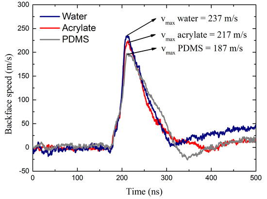 Figure 9 presents typical rear free-velocity profiles at 2.7 GW/cm for water as well as acrylate and PDMS polymeric confining materials. Figure 9 focuses on the first occurrence of the laser shock wave. The global shape was similar for the three materials: both the inflection on the shock front due to elastic precursor and the FWHM (55 ns) were alike. Some differences were highlighted in the end of the relaxation in relation to edge effects. However, maximum velocities were different, showing 237 m/s, 217 m/s, and 187 m/s for water, acrylate, and PDMS respectively. From rear free-velocity profiles, corresponding values were calculated from the incident power densities ranging from 0.22 GW/cm to 12.50 GW/cm. They are gathered in Figure 10 for water, acrylate, and PDMS.
