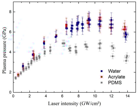 The chemical composition of the polymers can influence the breakdown threshold. Following this, the higher optical absorption of the PDMS favored material damage initiation compared to the acrylate confining medium. In fact, polymer damage was observed regardless of the polymer confinement used when high laser intensities were applied, typically when going higher than 3 GW/cm for the acrylate confinement, which seemed to be perfectly transparent except for the laser energy loss at the interfaces. With growing damages, plasma breakdown can initiate on defects, thus lowering the breakdown threshold. The confined plasma composition is a mix, coming from the contribution of the aluminum target and the polymer confinement material through ablation and plasma heating, respectively [29]. Maximum plasma pressures were also higher than previously published by Berthe in [18,30]. The difference could be due to the better laser spatial profile obtained by using a DOE and the simulation of rear free-surface velocity on the range of incident power density instead of using a constant attenuation. The present results clearly indicate the capability of polymers to reach pressures equivalent to water confinement. However, efforts must be made concerning the adhesion and mechanical properties of polymers for LSP configuration using high repetition rate shot without coatings by varying chemical composition and manufacturing parameters.