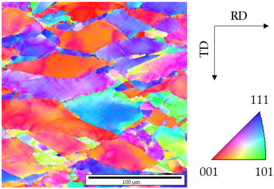 The resulting microstructure in the RD-TD section of the cold-rolled and warm-rolled strips was examined by EBSD using a JEOL JSM 7000F scanning electron microscope (JEOL Ltd., Tokyo, Japan) equipped with an EDAX Hikari EBSD detector (EDAX Inc., Mahwah, NJ, USA). The measurements were performed with an acceleration voltage of 20 kV and a step size of 200 nm. EBSD data was analyzed using the EDAX OIM Analysis 8 software (EDAX Inc., Mahwah, NJ, USA).