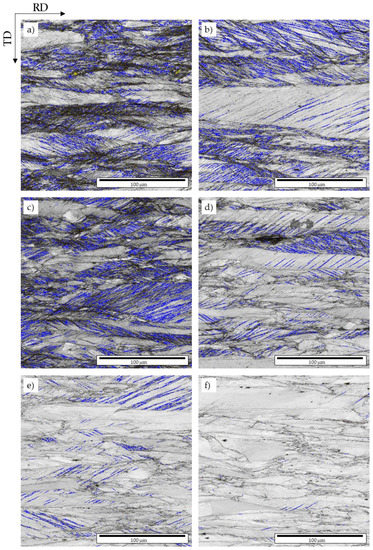 EBSD-IQ maps of the investigated steel deformed to 50% thickness reduction by (a) cold rolling and warm rolling at (b) 200 °C, (c) 300 °C, (d) 400 °C, (e) 450 °C and (f) 500 °C. Blue lines indicate deformation twin boundaries (60° <111>).