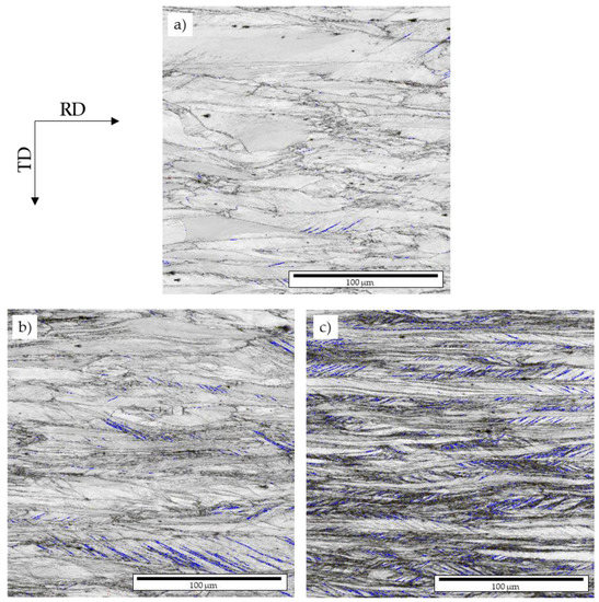 EBSD-IQ maps of the investigated steel warm-rolled at 500 °C to thickness reductions of (a) 50%, (b) 60%, and (c) 70%. Blue lines indicate deformation twin boundaries (60° <111>).