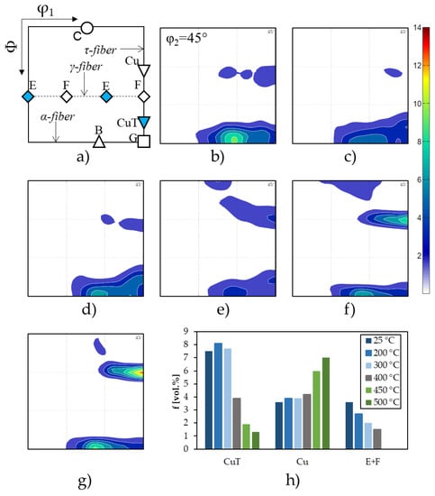 Texture formation of the material rolled to 50% thickness reduction at different temperatures. (a) Schematic presentation of the ideal texture component in the orientation distribution functions (ODF) section at φ2 = 45°. ODF sections at φ2 = 45° for (b) 25 °C, (c) 200 °C, (d) 300 °C, (e) 400 °C, (f) 450 °C, (g) 500 °C, and (h) presentation of the volume fractions of selected texture components.