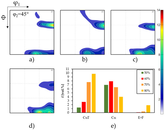 Texture evolution of the material rolled at 500 °C to different rolling reductions. ODF sections at φ2 = 45° of (a) 50%, (b) 60%, (c) 70%, and (d) 80% and (e) presentation of the volume fractions of selected texture components.
