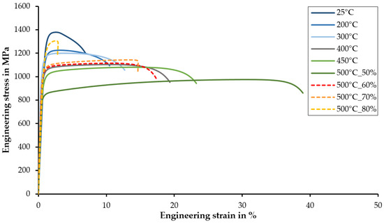 By increasing the thickness reduction at a constant warm rolling temperature of 500 °C, the yield and ultimate tensile strength (UTS) also increase. A thickness reduction of 80% results in an ultimate tensile strength of 1305 MPa but poor ductility. By increasing the thickness reduction to 60%, the ultimate tensile strength can be increased to 1114 MPa at a reasonable uniform elongation of 10.0%. The comparison of a thickness reduction of 60% and 70% therefore shows only a slight difference regarding strength and ductility.