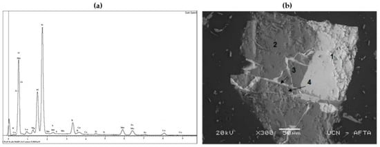 EDS analysis (a) and scanning electron microscopy (SEM) image (X 300) of sample LB (b). Association of (1) Cu-Mn-Fe-K-O (2) Si-O (3) Fe-O (4) Al-Fe-O.