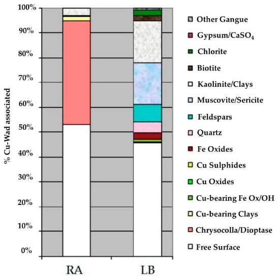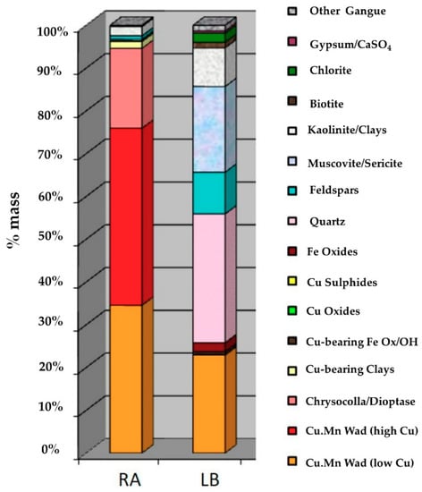 The feed samples used were identified as LB and RA. Samples were crushed and milled to a particle size 100% below 295 μm. The chemical composition was determined using inductively coupled plasma atomic emission spectroscopy (ICP-AES). The mineralogy of the samples was determined by X-ray diffraction (XRD). For XRD analysis, the sample was ground in an agate mortar to a size of less than 45 μm and analyzed in an automatic and computerized X-ray diffractometer (Siemens model D5600, Bruker, Billerica, MA, USA), with an analysis time of one hour. The ICDD (International Center for Diffraction Data) database was used to identify the species present. Qemscan analysis was performed using a Model Zeiss EVO Series, with Bruker AXS XFlash 4010 detectors and iDiscover 5.3.2.501 software. Qemscan analyses of exotic Cu deposits yielded more accurate and precise Cu mineralogy and deportment [].