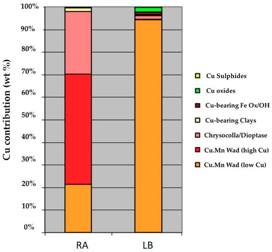 Figure 4 shows the distribution of copper in the samples. Low-content copper wad was 70% of the copper in sample RA, while the remaining 30% was mainly chrysocolla/dioptase. Low-content copper wad accounted for 95% of the copper in sample LB.