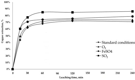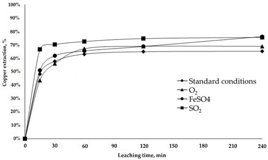 The addition of reducing agents (FeSO4 or SO2) decreases the redox potential to 696 and 431 mV, respectively, and favors the dissolution of manganese. This increases the overall copper extraction rate in minerals with high copper wad content. The use of SO2 resulted in the highest extraction rates of 86.2% for sample RA and 75.5% for LB, which is 15% higher than the rates obtained under standard conditions.