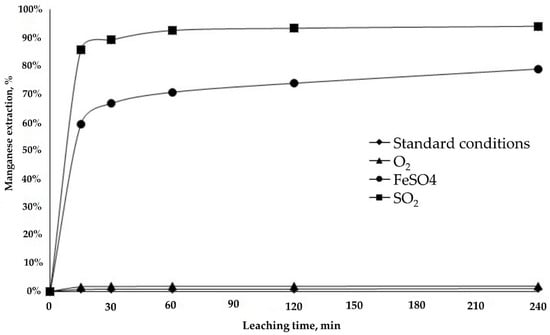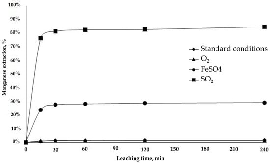The addition of the reducing agents had notable effects, in particular SO2 (■), which increased Mn extraction to 80% in less than 30 min (Figure 7). These results concur with those of [], who indicated that SO2 is a useful reagent. The benefit of SO2 is due to its rapid and selective dissolution, yielding manganese extraction rates from MnO2 of over 95% under moderate leaching conditions.