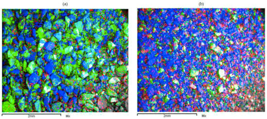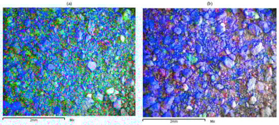 Figure 12 shows the comparative results of SEM mapping analysis for residues obtained from the LB sample under standard leaching conditions (12a) and under reducing conditions using FeSO4 (12b). An abundance of manganese and silica can be observed in Figure 12a, mainly resulting from Cu–Mn wad and quartz, respectively. This abundance is due to almost no Mn dissolution under standard leaching conditions (1% of Mn dissolved). The residue obtained under reducing conditions using FeSO4 was considerably less in the presence of manganese, but remained largely unchanged in the presence of quartz (12b). The low presence of manganese was due to the 80% dissolution rate obtained under these conditions. Finally, the presence of copper was due to the fact that 30% of copper could not be dissolved.