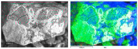 Figure 10a shows an abundance of manganese and silica, reflecting the low manganese extraction rate under standard leaching conditions (2% of Mn extracted). The presence of copper is still evident considering the high level in the initial sample (22.8% Cu). Figure 10a shows the Cu extraction rate at 70%, with no direct relationship with Mn extraction, due to the presence of chrysocolla or dioptase in the feed. Figure 10b shows a significant decrease of Mn in the residue when FeSO4 is used as a reducing agent (Figure 10b). The above had a direct effect in terms of increasing the copper extraction rate under these conditions (80%), thus giving way to the dissolution of species associated in the Cu–Mn wad that did not react. Figure 11 shows the approach to a particle from the leaching residue obtained using FeSO4. There is a notable presence of manganese that did not react. A low presence of copper is also evident. It thus seems that there are Cu–Mn phases (with a low presence of copper) without reacting.