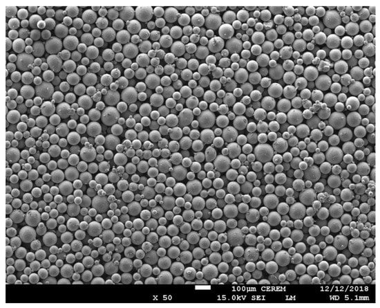 Scanning electron microscope image of Ti-6Al-4V powder particles.
