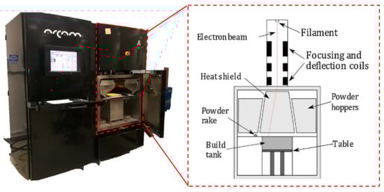 ARCAM (Sweden) EBM A2 technology was utilized for fabricating the specimens with default preheat and melting parameters set as shown in Figure 3. The electrons were emitted from a filament, which was heated at above 2500 °C. These high-energy electrons were accelerated through the anode.