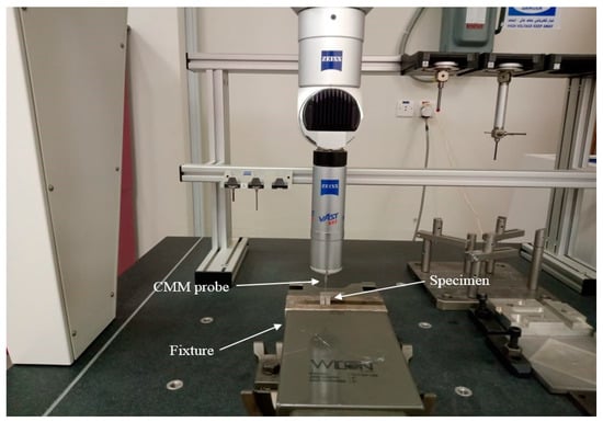The fabricated specimens were cleaned from the un-melted powder by sandblasting. The specimens were detached from the base plate by applying a very low force at the parting line using a sharp tool. In order to evaluate the overhang deformation, the coordinate measuring machine (CMM) was employed as shown in Figure 4. The lower left corner of the solid support was used as a reference point for measuring the coordinates of overhang warping. The total deformation at the extreme point of the overhang area was calculated using the difference between coordinates of the build part and the CAD model. The reference and measuring points are marked as ‘O’ and ‘P’ in Figure 1. Each measurement was performed three times using a highly accurate touch-trigger probe mounted on the CMM and the average value was calculated.