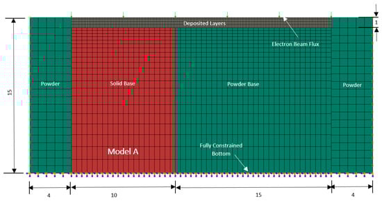 Model A, 2D finite element (FE) model for electron beam melting study of overhang structure (all dimensions are in mm).