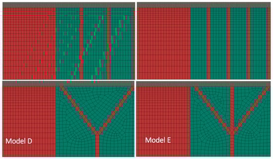 In this way, the model contains 40 steps for the deposition of 20 layers. The last step allowed the model to cool to room temperature and took approximately 17 min. Continuum plane strain elements with temperature degree of freedom (CPE4T) were used in coupled temperature displacement analysis. A very fine mesh was used for the deposited layers to account for steep temperature gradients across the deposited layers. A variable size mesh was used for the solid and powder substrate and it got finer close to the deposited layers as shown in Figure 5. In the same fashion, FE mesh for models with support structures, i.e., models B to E, were developed as shown in Figure 6. Contact between the layers and the powder-base was modeled using SURFACE-TO-SURAFACE CONTACT available in ABAQUS/STANDARD. On the other hand, the layers were attached to the solid-supports using mesh based TIE-CONSTRAINT. The models were run on a Dell Precision T1650 Workstation and required approximately 29 h of computational time for the deposition of 20 layers.