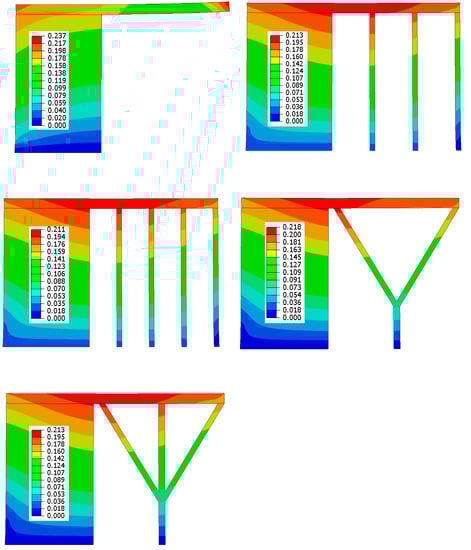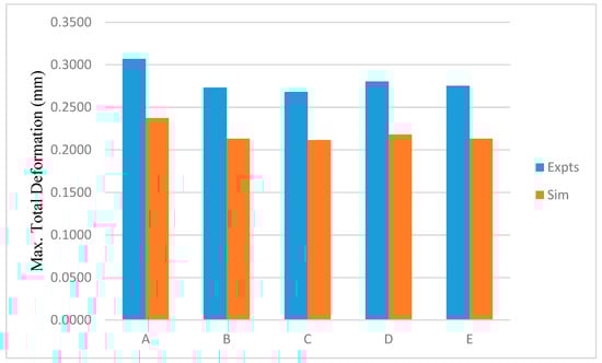 Total deformations obtained after the final cooling step are shown in Figure 10. As expected, deformations associated with model A were high and warping was clearly shown along the overhang area, i.e., the surface profile obtained using simulation was very much similar to the EBM fabricated part as shown in Figure 8. Models B to E showed low and comparable deformations due to their support structures. Model C with four straight column supports showed the least deformation whereas model D with Y-shaped supports had high deformation among other support structures. However, the differences were minor, i.e., around 3–4% and the choice of support structure depended on tradeoff between material utilization and structural rigidity.