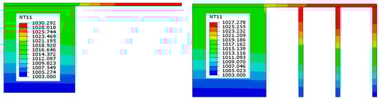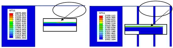 It was evident that temperatures were lower in model B in contrast to model A. This is again emphasizing increased heat transfer due to higher thermal conductivity of solid supports and consequently higher deformation/warping was expected with model A upon final cooling. Similar findings are reported by other researchers during EBM build of Ti-6Al-4V parts [,,]. After electron beam scanning, each layer was allowed to cool to preheat temperature by radiation and there existed a low temperature gradient after the end of cooling step as shown in Figure 12. Considering the solidus and liquidus temperatures of the alloy and the current temperature distributions, the phase transformation from powder to liquid and liquid to solid alloy could be predicted. Similarly, the temperature contours were also helpful in determining the size and shape of the melt pool during each layer build-up. As discussed earlier, a higher aspect ratio for the melt pool results non-uniform solidification and results in melt balls instead of solid layers []. Consequently, these temperature predictions would be helpful in predicting these defects and EBM parameters could be optimized accordingly.