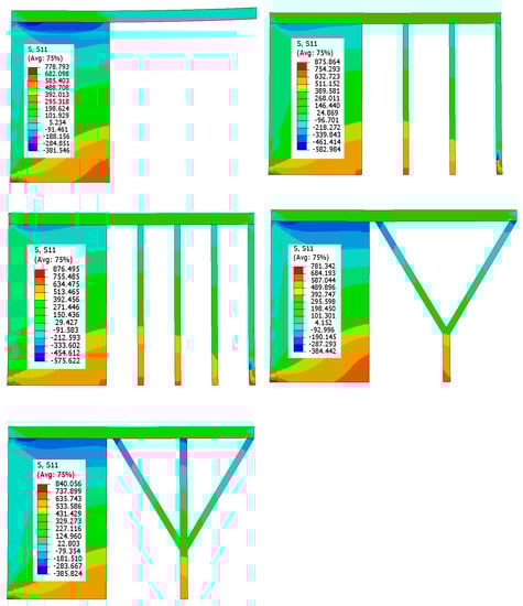 - The deposited layers for the models with support structures show uniform tensile stresses, which are balanced by the compressive stresses inside the support columns.