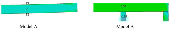 Residual stress contours for models B to E were very much similar. Uniform tensile residual stresses were seen for the layer overhang areas. These were balanced by the compressive residual stresses inside the solid supports as shown in Figure 9. Higher tensile and residual stresses were found with models B and C in comparison to models D and E as they were providing stronger support due to straight columns connected to the base plate. The residual stress patterns for the EBM build parts were very much similar to the work reported in [,]. The difference in the residual stresses pattern for the supported and unsupported models is illustrated by plotting some of the values for the deposited layers for model A and B as shown in Figure 14.