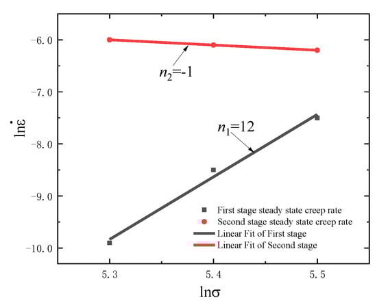 It is well established by a number of researchers, including Lei et al. [,] and Li et al. [,], etc., that the power-law creep Equation, Equation (1), may be used to describe dislocation creep behavior. Therefore, the n value in Equation (2) can be derived from Equation (1), which is plotted (on a log–log axis) in Figure 3. Information of the stress exponent n can be used to verify the creep mechanisms [].