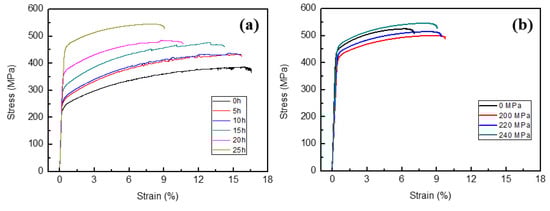 Figure 4a represents the engineering stress–strain curves during the creep aging process at 155 °C and 240 MPa. With the increase of creep aging time, the flow stress increased, and the elongation decreased. Figure 4b refers to the stress–strain curves of 16 h creep-aged samples under the condition of 155 °C and different applied stresses. Also, the stress–strain curves of 16 h stress-free (0 MPa) aged sample are carried out. The 16 h creep-aged sample under the applied stress of 240 MPa has the highest flow stress. With the decrease of applied stress, the flow stress decreases. However, the flow stress of the stress-free aged sample is larger than that of creep-aged samples under the applied stresses of 200 and 220 MPa. In addition, the stress-free aged sample has the lowest elongation in the four aged samples with various applied stresses.