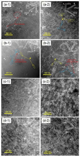 In the early stage of creep aging (1 h), there are a large number of dislocations induced by external stress in the alloy, which are also marked by red circles in the Figure 6(a-1). However, the dislocations in Figure 6(a-2) are obviously more than those in Figure 6(a-1). This indicates that the dislocations introduced by high stress are more than those in Figure 6(a-1). At the same time, there are a few precipitates in Figure 6(a-1,a-2), but they are not particularly obvious and are concealed under optical contrast. After ageing for 10 h, fine discoid/acicular T1 and θ’ phase begin to precipitate unevenly, and there is little difference in the number ratio of the two precipitates. It can also be seen that both T1 and θ’ phases precipitate along dislocation, which is consistent with the conclusion found in reference []. Moreover, the phase–orientation relationship of the two precipitates has been shown in the upper right corner of the graph, as shown in Figure 6(b-1,b-2). Aging lasted for 15 h, and a large number of T1 phases appeared in Figure 6(c-1,c-2) with uniform distribution. Compared with aging for 5 h, the number of T1 and θ’ phases increased and the growth rate of T1 phases was faster than θ’ phases with time. Most T1 and θ’ phases relative matrix precipitated along (11-1)/(1-11) and (200) planes, respectively. From Figure 6(d-1,d-2), the distribution of T1 phase is more uniform, the length and thickness of T1 phase increase significantly, the number of θ’ phases decrease, but the length and thickness increase.