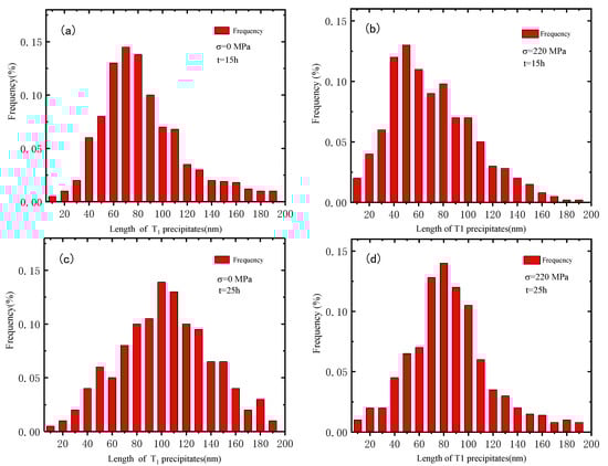 The precipitated phases of Al-Li alloy mainly consist of T1 phase and θ’ phase after creep aging at 153 °C (Figure 6), but because the number of θ’ phases is very small and the number of T1 phase is much more than that of θ’ phase, the latter analysis in this paper is mainly based on T1 phase. Using Image-pro plus image processing software, the length distribution of T1 phase was measured manually from the TEM image area (at least 200 precipitates in two sample areas), as shown in Figure 7. Comparing Figure 7a,c, the statistical averages are different, specifically, the statistical average of the data in Figure 6a is 75.79 nm; the statistical average of the data in Figure 7c is 120.5 nm. The peak value of T1 phase length distribution in stress-free aging shifts to the right, indicating that the T1 phase grows gradually with aging time increasing. The statistical average of the data in Figure 7b is 107.48 nm; the statistical average of the data in Figure 7d is 81.09 nm. The peak value of T1 phase length distribution of 220 MPa stress aging shifted slightly to the right, indicating that T1 phase did not continue to grow during this process. And the distribution of Figure 7c is more uniform than that of Figure 7d, which indicates that the distribution of T1 phase is more uniform than that of stress-free aging.
