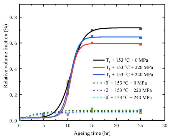 where fv is the true volume fraction and fp is the maximum volume fraction. Due to the actual application requirements of the project and considering the manufacturing cost, the creep aging process of the alloy Al-Li-S4 aluminum alloy was not subjected to peak aging, only to 25 h. Therefore, in this paper, the maximum volume fraction of precipitated phases at different time in actual measurement is taken. At the same time, because Al-Li-S4 aluminum alloy has multiphase precipitation, in order to clarify the precipitation competition among various precipitated phases, the sum of T1 and phase volume fraction is taken as the maximum value. Figure 8 shows the relative volume fraction of T1 phase and phase of Al-Li-S4 aluminum alloy under different stress creep aging conditions. From Figure 8, it can be seen that the relative volume fraction of T1 phase and phase did not change at 15–25 h, indicating that T1 phase and phase did not precipitate after 15 h and began to coarsen.