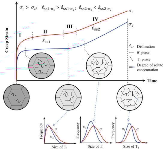 In the first stage of creep, although the solute elements in the matrix are consumed due to the partial precipitation of precipitated phase, the creep rate increases sharply due to the application of applied stress and the continuous movement of dislocations, and dislocation strengthening plays a major role in this stage, which leads to the decrease of creep rate. The larger the applied stress is, the more dislocations are introduced, and the more the creep amount produced in the first stage of creep is. This indicates that the difference caused by different applied stress mainly occurs in the first stage of creep. In the second stage of creep (steady state creep in the first stage), T1 and θ’ phase precipitate continuously at dislocations, solute elements in the matrix continue to be consumed, dislocations decrease, and the equilibrium state between precipitated phase, solute atoms and dislocations is reached. In the third stage of creep, it can be seen that due to the accelerated nucleation and precipitation of T1 phase, the number of solute atoms in the matrix decreases sharply, which leads to the decrease of creep resistance [,], and the increase of creep rate at this stage. In the fourth stage of creep (steady state creep in the second stage), as aging proceeds, T1 phase begins to coarsen, which makes dislocations more prone to occur and causes creep to greatly increase, but the coarsened T1 phase distributes more uniformly and compactly under stress.