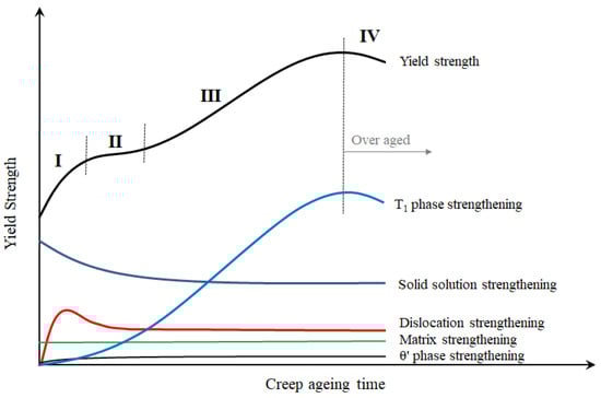 On the basis of the experimental results, a schematic diagram can be supposed for considering the contribution of the different acting mechanisms to the yield strength, which is shown in Figure 10. The multi-step of the studied Al-Li alloy in yield strength can be divided by procedure into four stages, that is, rapid increase stage (caused by strain hardening), slow increase stage, second rapid increase stage (caused by precipitation hardening) and slow decrease stage (known as over aged stage). For the change in the yield strength of the alloy in Figure 5a, first, the relationship between the strength of the alloy and the precipitated phase is such that the size and distribution of the precipitated phase determine the strength of the alloy. According to the change of the precipitated phase described above, the T1 phase is the main strengthening phase of the alloy and tends to be stable after 15 h and begins to coarsen.