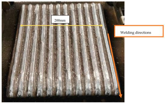 To illustrate this anticipated effect, a layer of FeNi36 was welded into a prepared groove (5 mm deep and 10 mm wide) of a S700M base plate (200 mm × 300 mm × 15 mm) at the base of the fillet weld, which could be easily plasticized and deformed. The plates dimensions welded on the base plate were 100 mm × 300 mm × 15 mm. The distance between the two grooves made were 25 mm from inner edge to inner edge. The welding parameters of the pendulum bead were chosen in such a way that no pronounced heightening compared to the base material occurred, Figure 7.
