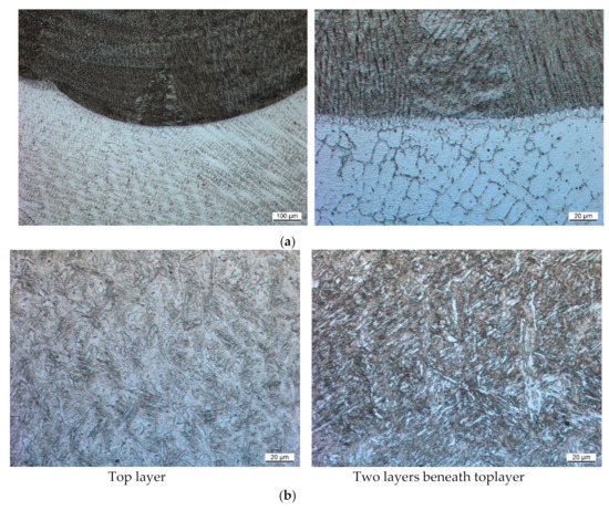 Figure 5a shows the transition from high strength deposition to soft matrix. This shows two microstructural morphologies which are separate from each other. Furthermore, no pores, cracks or inclusions are visible. Figure 5a shows that martensitic and austenitic microstructures can exist side by side without a pronounced interface region. In the top layer, a clear martensitic microstructure can be determined, as shown in Figure 5b. Two layers beneath the top layer a tempered martensite can be determined.