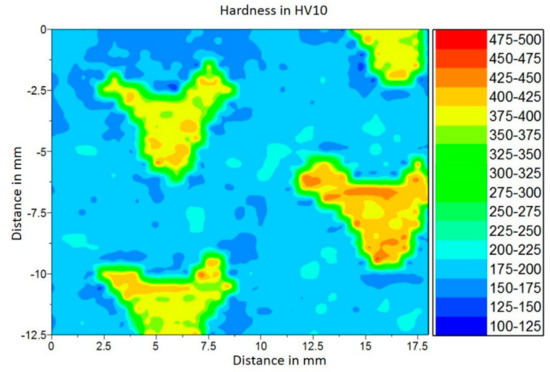 Looking at the overview of the hardness distribution in Figure 6, it can be clearly seen that the hardness of the soft FeNi36 matrix was homogeneously distributed. A drop in hardness can be found around the strengthening parts due to dilution. The high strength depositions are clearly visible in the hardness measurement. To evaluate the mechanical properties, the tensile strength of the welded specimen was determined. A possible anisotropy was detected by comparing the yield strength and tensile strength between the three different specimen orientations. The mechanical properties of the base materials are listed in Table 2 for illustration purposes.