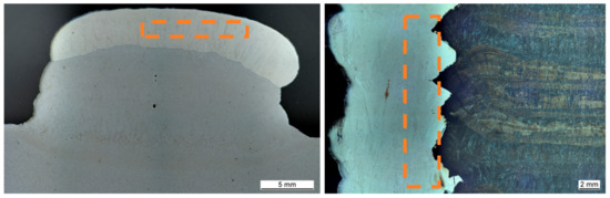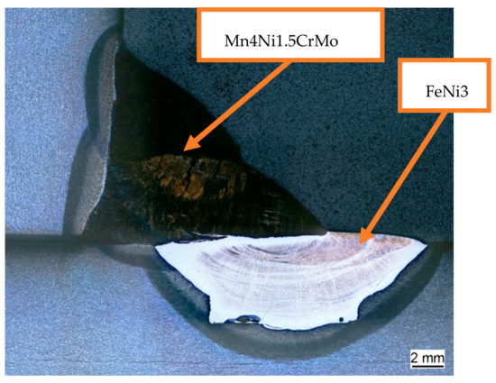 In addition, a micrograph and a specimen for hardness measurement were prepared from the welded test piece. Furthermore, the microstructures were analyzed. Figure 4 shows a micrographic cross section transverse to the welding direction. The different materials are clearly distinguishable. Furthermore, due to the different etching behavior, zones of different dilution in the low-alloy material can also be identified.