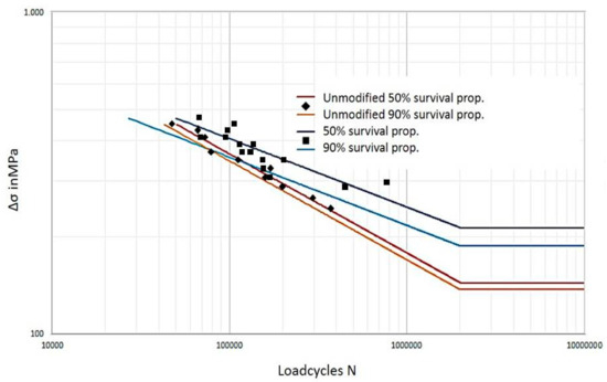 To determine the behavior of the joint under fatigue, S/N curves according to DIN 50100 were taken. For the unmodified joint 10 specimen in the of the fatigue strength straight line were test. For the modified joint 15 specimen in the fatigue strength line were tested. It can be seen that the FAT-class could be increased by more than 35% due to the good plastifiable layer in the notch base of the highest loaded position at the weld toe, Figure 9.