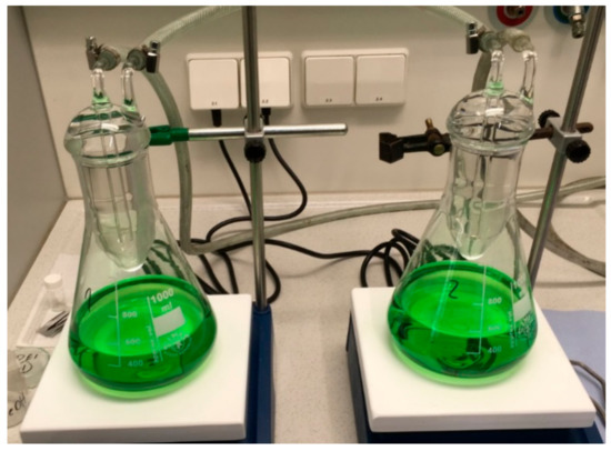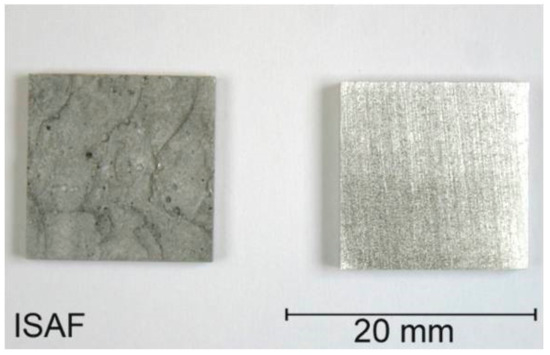 Sample preparation and testing were carried out in accordance with ASTM G48-A. The test medium used was an acid in accordance with “Green Death” with the composition (11.5% H2SO4, 1.6% HCl, 1% FeCl3, 1% CuCl2, 84.9% H2O) at a temperature of 40 °C. The pH value of the solution was 0. Figure 12 shows the test setup. The material loss due to corrosive processes was determined at various intervals. The chemical composition was determined by EDX (energy-dispersive X-ray spectroscopy) analysis.