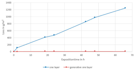 Even when looking at the material loss, it can be seen that the single layer protective layer diluted by the non-corrosion resistant material clearly loses material, while the sample produced generatively with targeted control of the dilution shows almost no removal, Figure 14.
